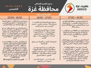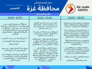 غزة: أعلنت شركة توزيع كهرباء غزة، فترة العجز المتوقع للفترة الصباحية والمسائية ليوم الخميس.