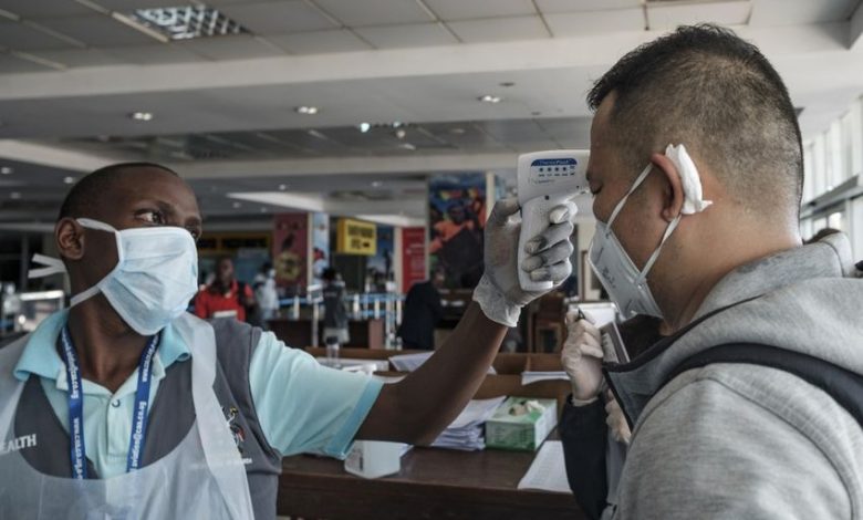 A passenger originating from China has his body temparature taken upon arrival on an international flight as he waits to be screened for signs of the novel coronavirus at Entebbe Airport on March 3, 2020. - The deadly virus has marched well beyond China's borders, spreading across Asia and Europe and into Latin America, Africa and the United States. More than 90,000 people have been infected and 3,100 killed since the virus first emerged in China's Hubei province late last year. (Photo by SUMY SADURNI / AFP)