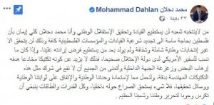 وأوضح دحلان “أتمنى من الجميع أن لا نقع في شرك مثل هذه التكتيكات المهندسة بدقة، ولنعمل معا لإستعادة وحدتنا الوطنية والإتفاق على ثوابتنا الوطنية ووسائل تحقيقها فلا شيء يستحق الصراع حوله داخليا، وكل القدرات والطاقات ينبغي أن تكرس وجوبا لتحرير وطننا وشعبنا العظيم”.